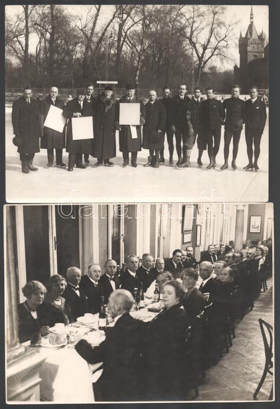 Beschreibung: cca 1930 Korcsolyaverseny zsűrije a városligeti műjégen és ünnep vacsora, 2 db pecséttel jelzett fotó Pobuda Alfréd budapesti műterméből, 18×23 cm