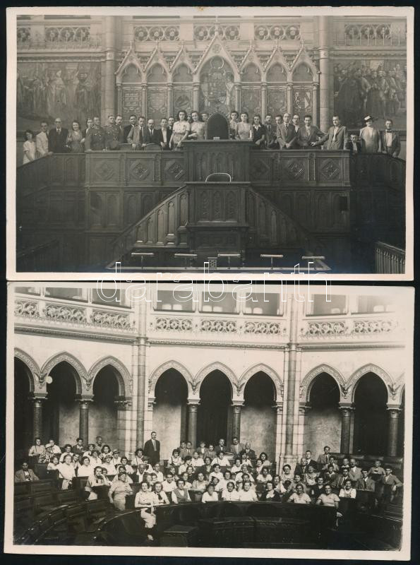 Beschreibung: cca 1935 Csoportképek az Országházban, 2 db fotó, egyik hátoldalon feliratozva, 12×18 cm