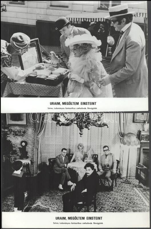 cca 1989 előtt készült, "Uraim, megöltem Einsteint" című, tudományos-fantasztikus csehszlovák film jelenetei és szereplői, 9 db vintage produkciós filmfotó (vitrinfotó, lobbyfotó) ezüst zselatinos fotópapíron, a használatból eredő (esetleges) kisebb hibákkal, 18x24 cm