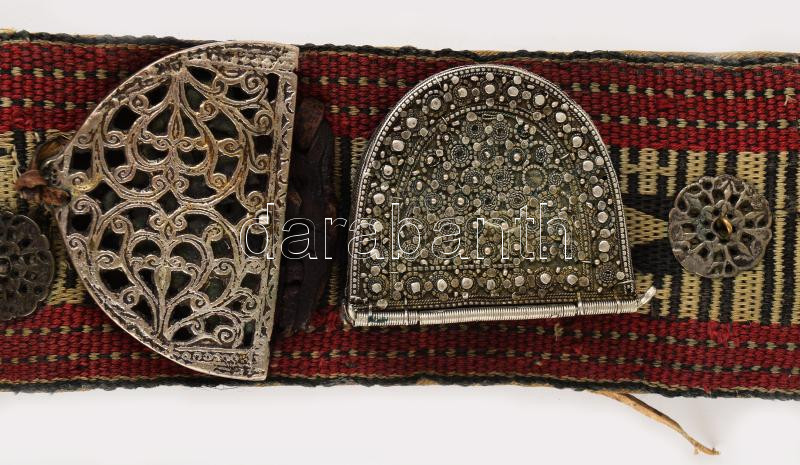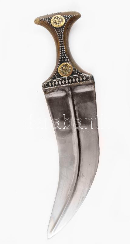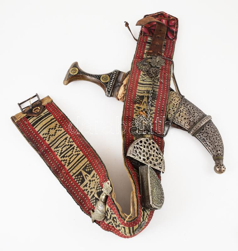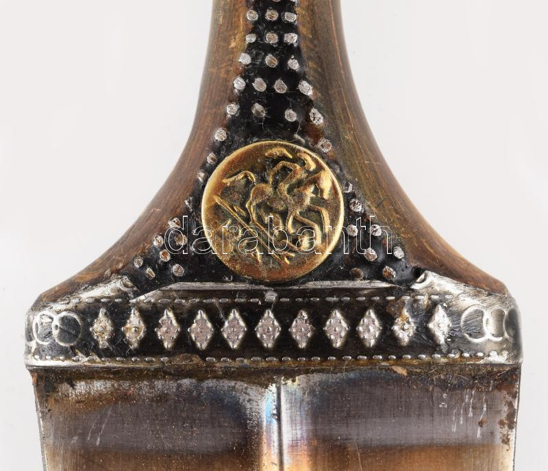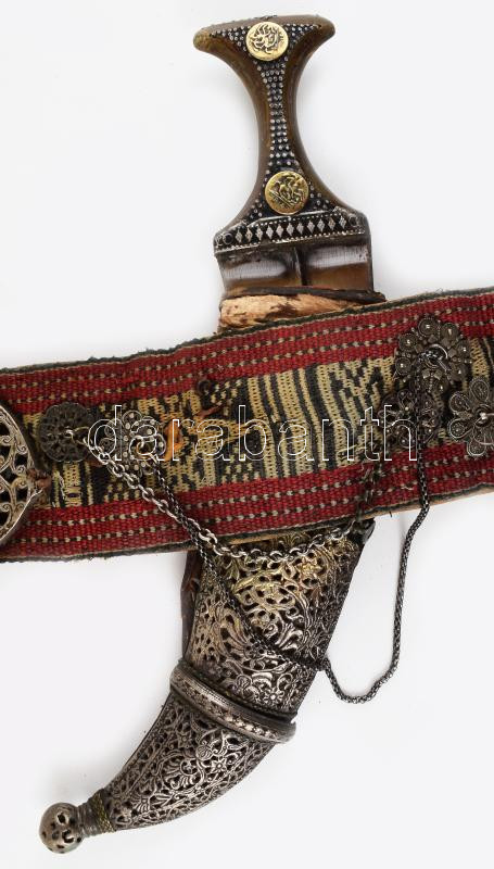 Dzsambia / Handzsár. Jemen, 20. sz. első harmada, iparművész munka, berakásokkal díszített csont markolattal, korabeli és későbbi díszítményekkel, h: 37cm, 85cm