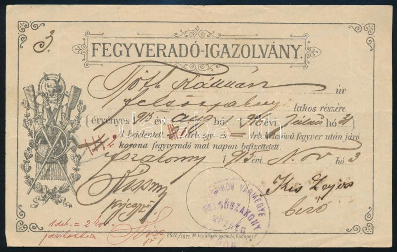 1915 Fegyveradó igazolvány https://www.darabanth.com/de/504-Fernauktion/504.0/Kunst-Dokumente-andere-Sammelgebiete/Dokument~1000002/1915-Fegyverado-igazolvany~II3424942