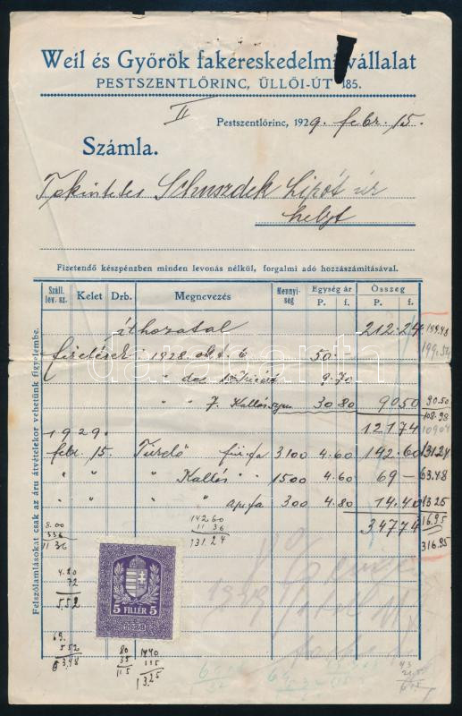 1929 Pestszentlőrinc, Weil és Győrök fakereskedelmi vállalat fejléces ... https://www.darabanth.com/de/504-Fernauktion/504.0/Kunst-Dokumente-andere-Sammelgebiete/Dokument~1000002/1929-Pestszentlorinc-Weil-es-Gyorok-fakereskedelmi-vallalat-fejleces-szamla-szakadassal~II3423695