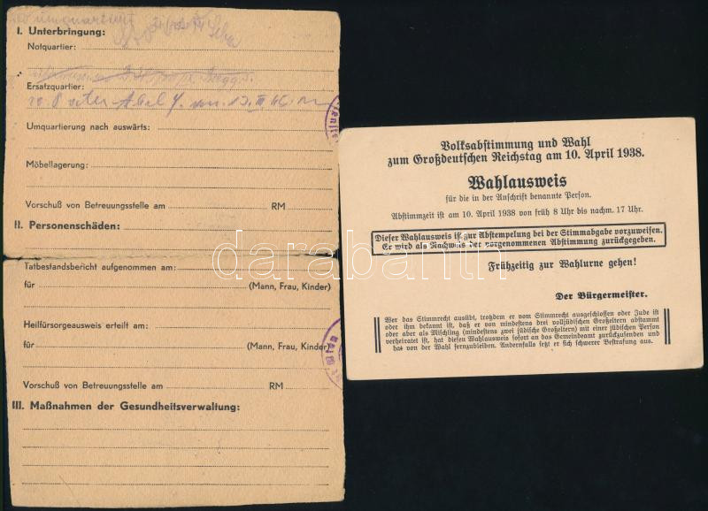 Beschreibung: 1938 Reichstag választási igazolvány. + 1944 Bombázás áldozatainak segélykártyája