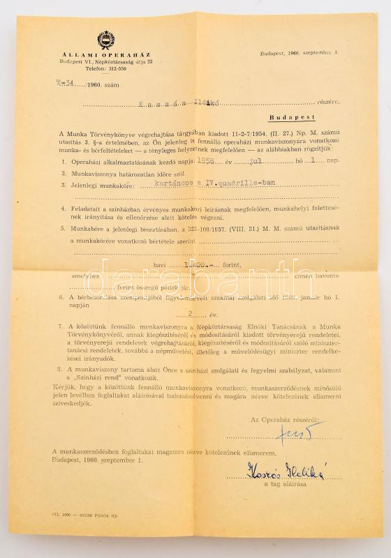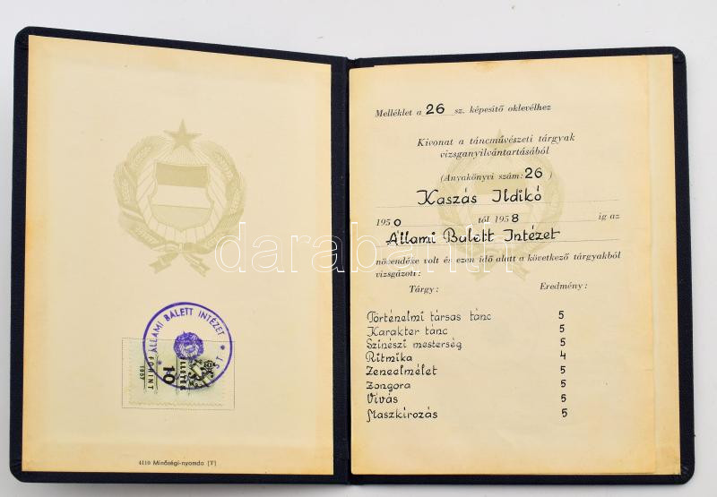 1950-1972 Kaszás Ildikó (1941-2024) balett-táncos, koreográfus okmányai, összesen 7 db, közte Állami Balettintézet leckekönyve és bizonyítványa, az Állami Operaházzal kötött munkaszerződése, középiskolai tanulmányi értesítő, előadóművészi működési engedélyek