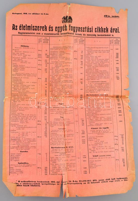 1918 Az élelmiszerek és egyéb fogyasztási cikkek árai. Plakát, ragaszt... https://www.darabanth.com/de/504-Fernauktion/504.0/Kunst-Dokumente-andere-Sammelgebiete/Drucksachen~1000017/1918-Az-elelmiszerek-es-egyeb-fogyasztasi-cikkek-arai-Plakat-ragasztva-sarkan-kis-hiannya~II3409062