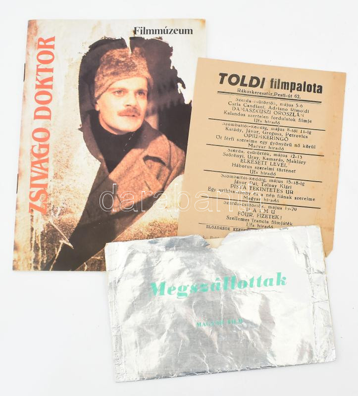 3 db film és mozi témájú kiadvány: Toldi filmpalota műsora + Megszállottak c. magyar film rövid ismertetője és 4 képe, borítékkal + Filmmúzeum - Zsivago doktor ismertető füzet
