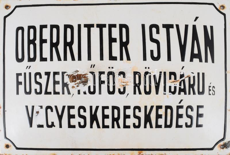 Beschreibung: Antik zománcozott fém tábla "Oberritter István Fűszer, Rőfös, Rövidáru és Vegyeskereskedése" felirattal, zománchibákkal, 24,5x35 cm