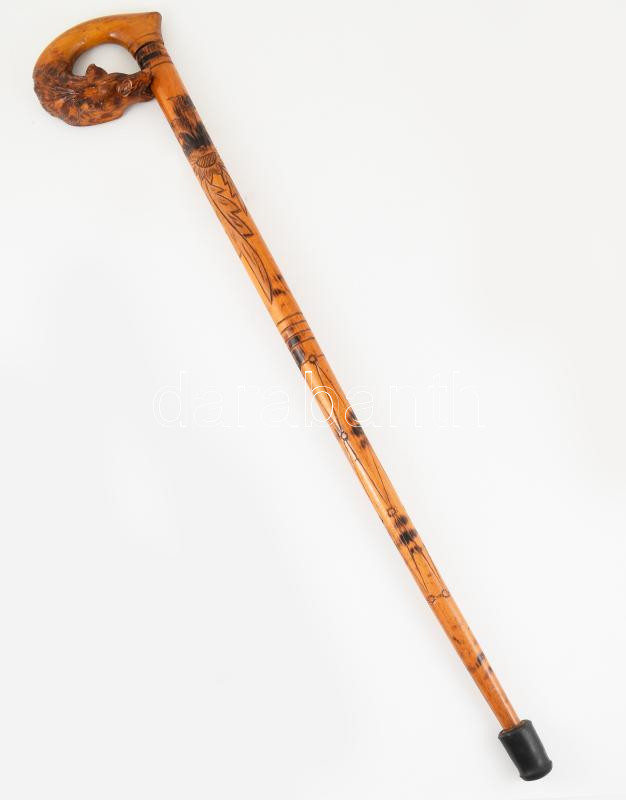 Beschreibung: Farkasfejes sétabot. Faragott fa, lakkozott 95 cm