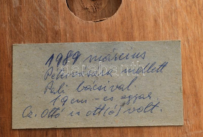 Beschreibung: Vadásztrófea, 2 vaddisznóagyar, fára applikálva, d: 19,5 cm