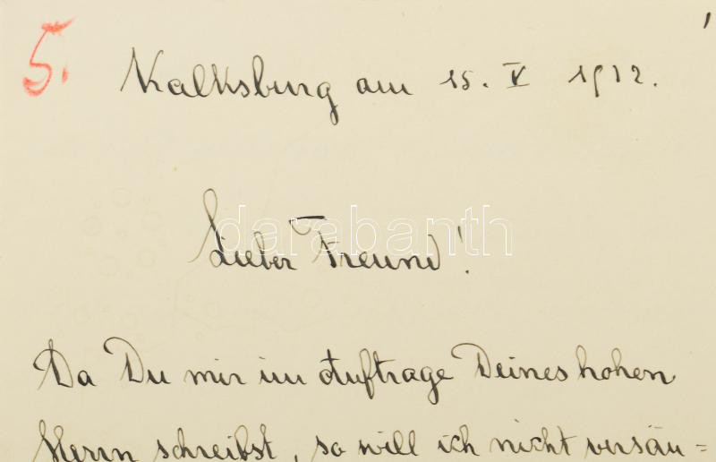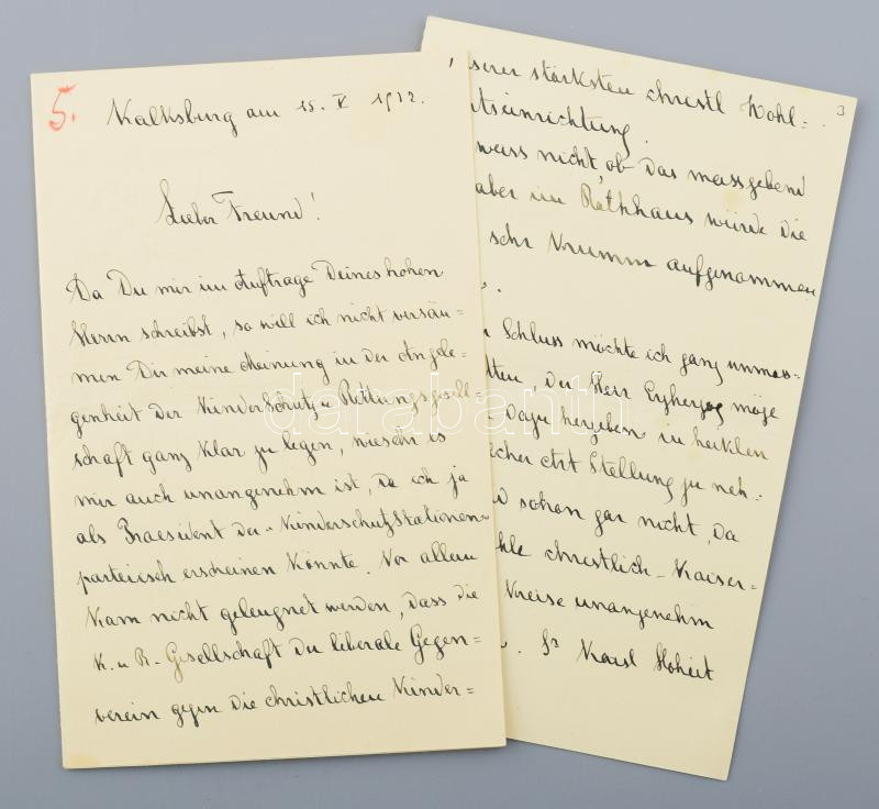 1912 Azonosítatlan Ferdinánd feladó levele a Habsburg család egyik tagjának, Kalksburgból, a híres katolikus nevelő intézetből, gyermekvédelmi intézet ügyében, megemlítve több más Habsburg családtagot is 5 beírt oldalon / Letter from Ferdinand ... to a member of the Habsburg family from Kalksburg, the famous Catholic educational institute, regarding the child protection institute, mentioning several other members of the Habsburg family on 5 pages