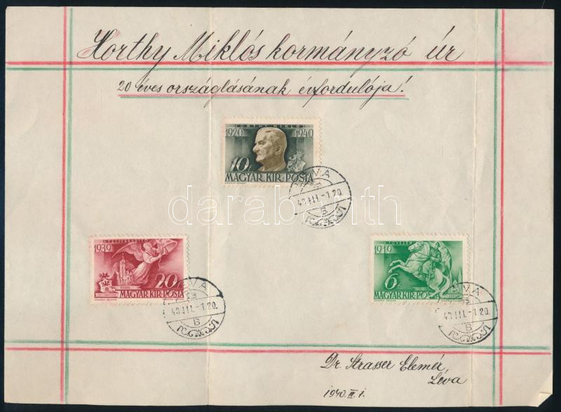 1940 Horthy Miklós emléklap alkalmi bélyegzésekkel https://www.darabanth.com/de/504-Fernauktion/504.0/Kunst-Dokumente-andere-Sammelgebiete/Historische-Dokumenten-Handschriften~1000003/1940-Horthy-Miklos-emleklap-alkalmi-belyegzesekkel~II3424541