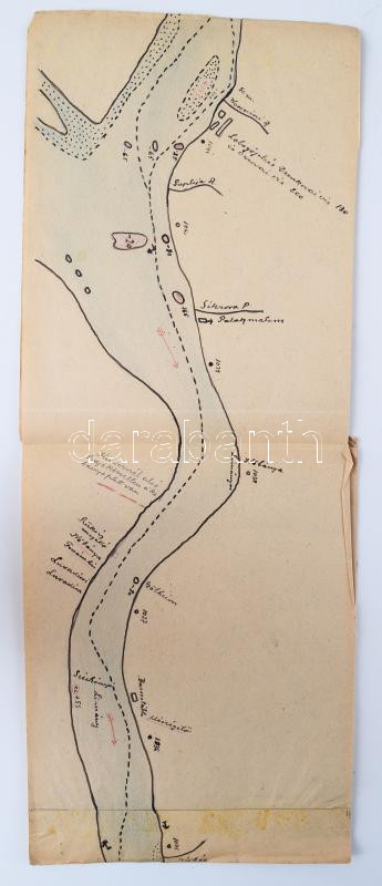 1942 ,,Aldunai zuhatagi szakasz térképe a hatósági hivatalos térkép után. Ómoldova-Drenkova-Cosla 1048 - 1013 km 35 km. Karácsonyi László hkpt. 1942 XII hó." Kihajtható, kézzel rajzolt térkép az Al-Duna szakaszáról, jelmagyarázattal, 16x225 cm