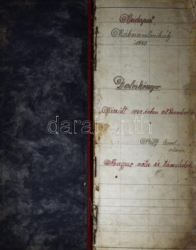 1948 Bp.-Rákosszentmihály, ,,Daloskönyv. Készült 1948. évben November 12-én Pálffy Ernő részére. Magyar nóta és táncdalok." Kézzel írt, ill. kivágásokból beragasztott dalszövegek gyűjteménye, összesen kb. 60 oldalon, viseltes egészvászon-kötésben, 33x14 cm