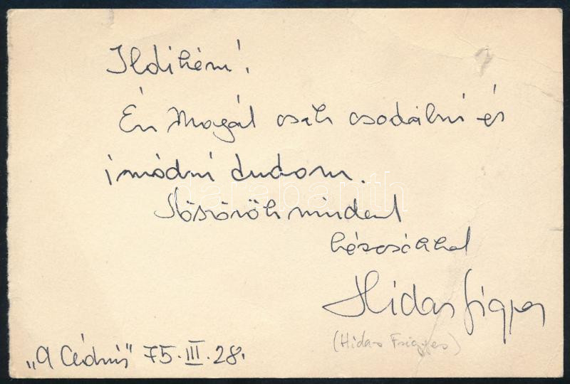 1975 Hidas Frigyes (1928-2007) zeneszerző, a Fővárosi Operettszínház zenei igazgatója autográf aláírása és sorai Kaszás Ildikó (1941-2024) balett-táncos, koreográfus részére