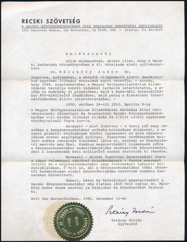 1981 Recski Szövetség (San Bernardino) igazolása Recsken raboskodott p... https://www.darabanth.com/de/504-Fernauktion/504.0/Kunst-Dokumente-andere-Sammelgebiete/Historische-Dokumenten-Handschriften~1000003/1981-Recski-Szovetseg-San-Bernardino-igazolasa-Recsken-raboskodott-politikai-uldozott-resz~II3424872