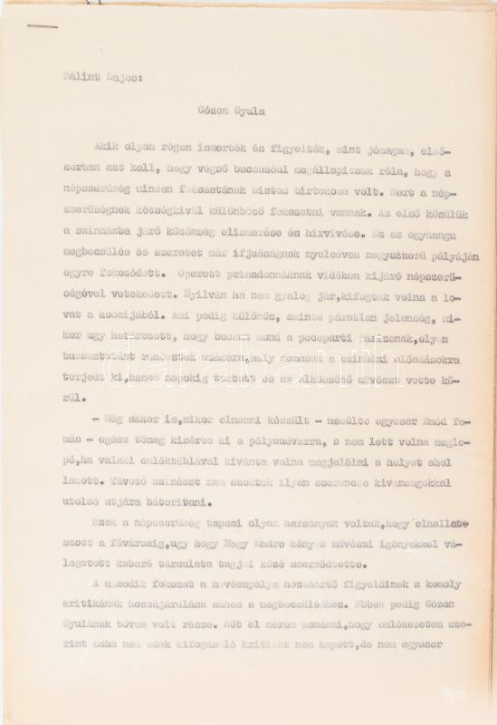 Bálint Lajos, szül. Bleier (1886-1974) műkritikus, dramaturg, író, műfordító, a Thália Társaság egyik megalapítójának és titkárának 4 db gépelt kézirata: Gózon Gyula; Hevesi [Sándor]; Somogyi Erzsi; Egy család 150 éve. Vegyes állapotban.