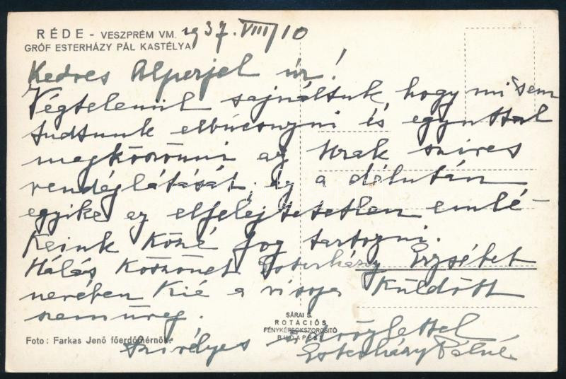 ca 1940 Esterházy Pálné ? autográf kézírása rédei kastélyukat ábrázoló... https://www.darabanth.com/de/504-Fernauktion/504.0/Kunst-Dokumente-andere-Sammelgebiete/Historische-Dokumenten-Handschriften~1000003/ca-1940-Esterhazy-Palne-autograf-kezirasa-redei-kastelyukat-abrazolo-kepeslapon~II3419370