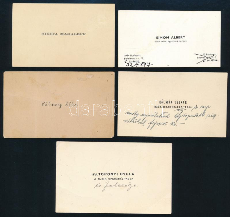 cca 1910-1990? Vegyes névjegykártya tétel, 5 db, köztük Kálmán Oszkár (1887-1971) operaénekes, a M. Kir. Operaház tagja, ifj. Toronyi Gyula (1896-1966) operaénekes, a M. Kir. Operaház tagja, Simon Albert (1926-2000) karmester, zenetudós és zenepedagógus, Nikita Magaloff (1912-1992) georgiai - orosz zongorista, és Pálmay Ilka (1859-1945) színésznő névjegykártyái.