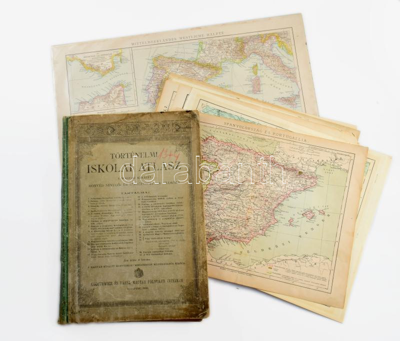 1900 Történelmi iskolai atlasz a magyar királyi honvéd nevelő- és képzőintézetek számára. Bp., 1900, Kogutowicz és Társa Magyar Földrajzi Intézete. Kiadói félvászon-kötés, viseltes, kopott, foltos borítóval és gerinccel, régi intézményi bélyegzőkkel. + 22 db vegyes régi térkép
