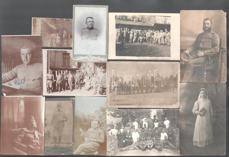 Beschreibung: 12 db vegyes katona fotó az első világháborúból, nővér, tisztek, lövészárok, stb., vegyes méretben