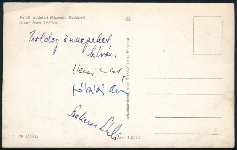 Beschreibung: cca 1967 Szekeres László (1927-2014) irodalomtörténész, muzeológus és két másik beazonosítandó aláírás, Petőfi Irodalmi Múzeum Arany János képeslapján