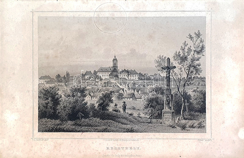 Ludwig Rohbock (1824-1893) nürnbergi grafikusművész, tájképfestő. Európa számos országát bejárta, a Duna vidékét először 1855-ben kereste fel, 1856-1863 között utazta be hazánkat, számos vázlatot készítve. Romantikus látképei kissé idealizálják a valóságot, ám meglepő pontossággal örökítik meg Magyarország és Erdély kiemelt fontosságú épületeit, utca- és városképeit, várromjait és várait, kastélyait, fürdőit és hegycsúcsait, templomait és kolostorait. A német festő kiemelt figyelmet szentelt a bemutatott vidék néprajzi karakterének, a látképek előterében a korabeli városi és népi viseletek eredeti környezetükben tűnnek fel, az előtér emberi jelenetei egyben megörökítik a századközép szokás- és viselkedésrendjét. Látképünkön a korabeli Balaton legfontosabb városának nevezett Keszthely fő nevezetessége, a Festetics-kastély és környezete látható, keleti irányból, a jurátusok 1818-ban állított kőkeresztje mellől, az egykori temetődomb felvételi pontjáról, mely felvételi pont a mai Vásár tér környékén fekszik. Látképünk középpontjában a kastély harangtornya, tőle mindkét irányban a kastély szárnyai húzódnak. Képünk bal szélén az ekkoriban is szállóhelynek számító Amazon-ház, a középponti harangtoronyhoz kisebb ház csatlakozik, majd dombtetőjéről kisebb, parasztházak kísérte utca ereszkedik nézőpontunk felé. Képünk előterében a ligetes-fás temetődomb fakeresztjei, jurátusi kőkeresztje, valamint a pázsiton helyt foglaló hölgy, és a vele szemben álló, botjára támaszkodó férfi alakja látható. Rohbock egykori látképe óta a kastély alaposan kibővült, a szintkülönbségeket áthidalták, a felvételi helyszínként szolgáló temető felszámolták, a jurátusok kőkeresztjét pedig a Balaton Múzeumba szállították át. Látképünk a Hunfalvy János szövegével megjelent "Magyarország és Erdély eredeti képekben" című háromkötetes, illusztrált topográfiai mű második kötetében jelent meg, acélmetszetünk a kötet 342. oldalához tartozó, éles kontúrú metszet.