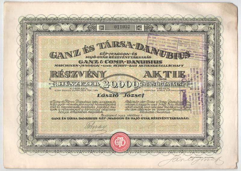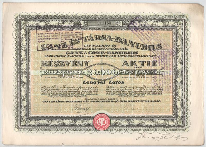 1923. Budapest "Ganz és Társa- Danubius Gép-, Waggon- és Hajó-Gyár Részvénytársaság" részvénye 20.000K-ról, magyar és német nyelven, szárazpecséttel, bélyegzésekkel és szelvényekkel (3x) T:XF-F