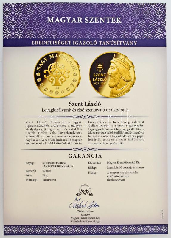 ifj. Szlávics László (1959-) 2011. "Nagy Magyarok / Szent László" aranyozott Cu emlékérem kapszulában, tanúsítvánnyal (40mm) T:PP