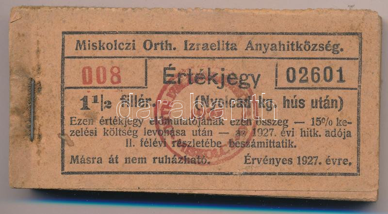 1927. Miskolc 1 1/2f "Miskolczi Orth. Izraelita Anyahitközség&quo... https://www.darabanth.com/de/504-Fernauktion/504.0/Numismatik/Notgeld-aus-Papier-und-Metall~4500053/1927-Miskolc-1-12f-3Cem3EMiskolczi-Orth-Izraelita-Anyahitkozseg3Cem3E-ertekjegye-18-kilogramm~II3420181