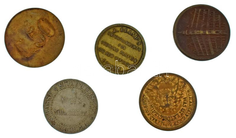 ND 5xdiff advertising money / token lot, (in it Berlin, Wien, London, etc.) C:XF,VF, patina