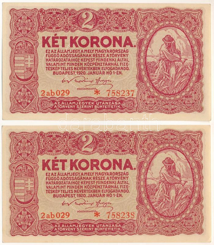1920. 2K csillagos sorszámmal (2x) sorszámkövetők "2ab029 * 75823... https://www.darabanth.com/de/504-Fernauktion/504.0/Numismatik/Ungarische-Banknoten~4500054/1920-2K-csillagos-sorszammal-2x-sorszamkovetok-2ab029-758237-2ab029-758238-TAU3Cbr-3E~II3420992