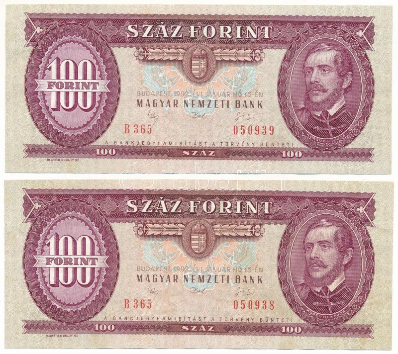 Beschreibung: 1992. 100Ft (2x) sorszámkövetők "B 365 050938 - B 365 050939" T:F, szép papír, tűlyuk, egyiken pici szakadás