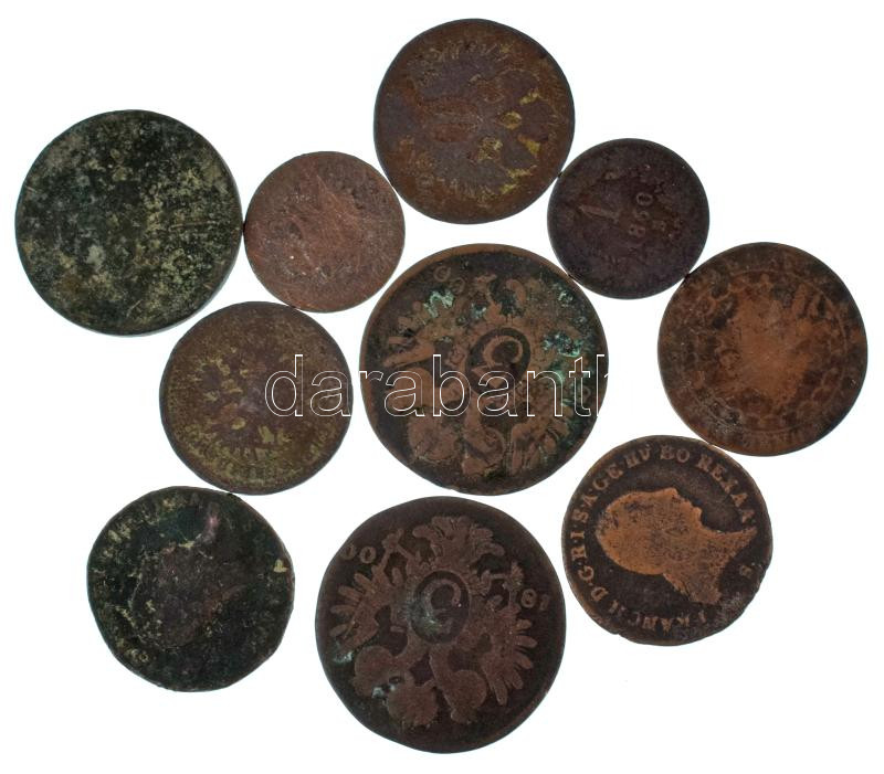 1800-1861. 1kr-4kr Cu (10db) T:F,VG https://www.darabanth.com/de/504-Fernauktion/504.0/Numismatik/Ungarische-Munzen-und-Munzen-mit-ungarischem-Munzzeichen~4500055/1800-1861-1kr-4kr-Cu-10db-TF-VG~II3419955