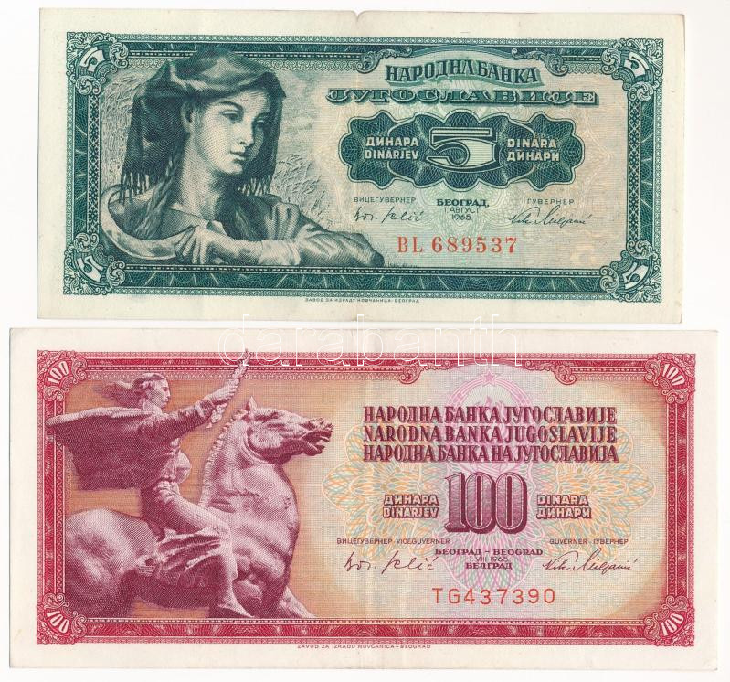 Yugoslavia 1965. 5 Dinara + 100 Dinara C:F thinned at centre fold, slight missing material but nice paper