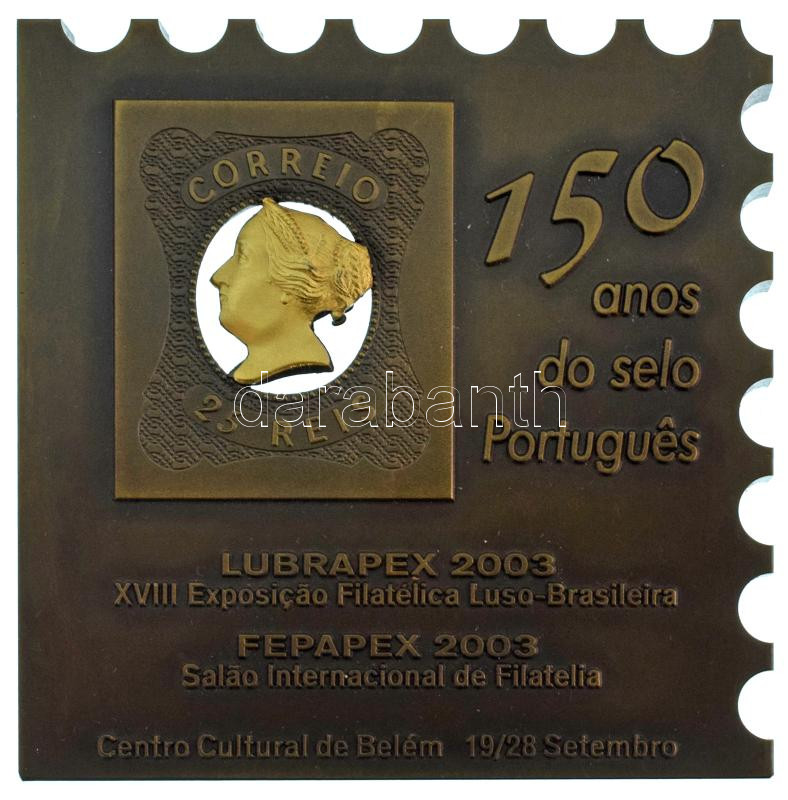 Portugália 2003. "A Portugál bélyeg 150 éves Jubileuma - Lubrapex 2003 XVIII. Luso-Brazil Filatéliai Kiállítás - Belém Kulturális Központ - Szeptember 19/28" egyoldalas, részben aranyozott bronz emlékplakett bársony erszényben (80x80mm) T:AU