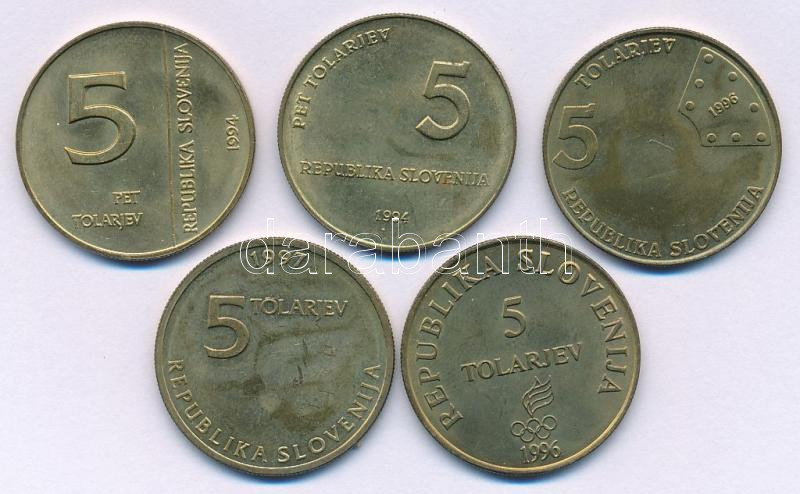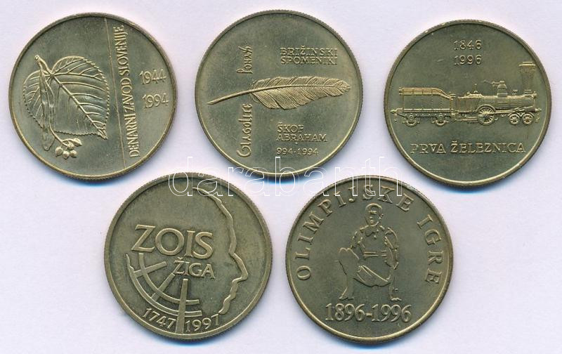 Slovenia 1994-1997. 5 Tolarjev Ni-brass 5xdiff circulating commemorative issue: "Bishop Abraham - Freising Manuscripts " + "Olympics centennial " + "First railway in Slovenia " + "Monetary Institute of Slovenia " + "250th Birthday of Žiga Zois " C:AU,XF