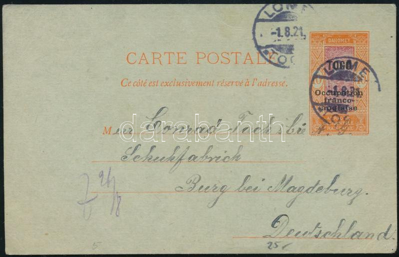Beschreibung: Brit-francia megszállás 1921 Díjjegyes levelezőlap késői felhasználása német katolikus miszióból, "LOME", R!