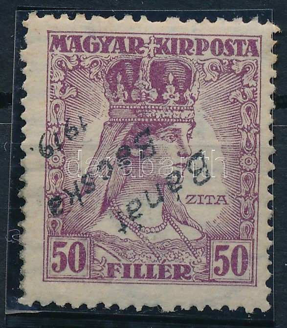 Beschreibung: Bánát-Bácska 1919 Zita 50f fordított felülnyomással, Bodor vizsgálójellel (22.000) (foghiba / perf. fault)