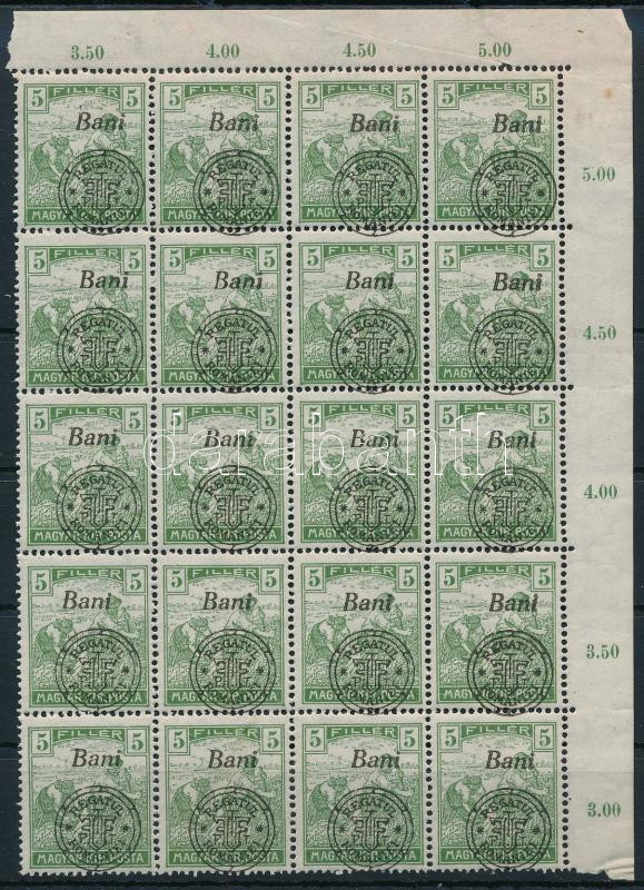 Beschreibung: Nagyvárad 1919 Arató 5f 20-as tömb elcsúszott felülnyomással, Bodor vizsgálójellel (saroktörés, rozsda / folded corner, stain)