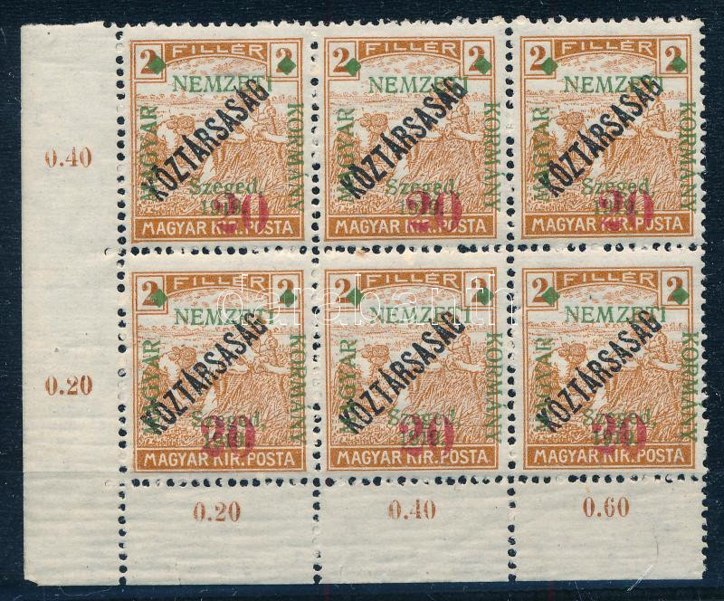 Szeged 1919 Arató/Köztársaság 20f/2f ívsarki hatostömb, a 20-as lecsúszott, illetve az 1919 -es évszámban vastagabb és vékonyabb számok / Mi 32 block of 6 with shifted overprint and plate varieties. Signed: Bodor