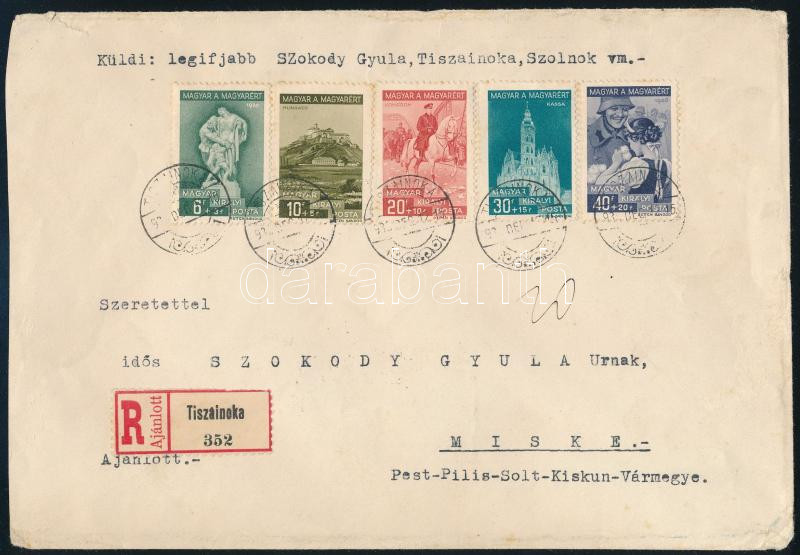 1939 Magyar a magyarért sor ajánlott levélen "TISZAINOKA" - ... https://www.darabanth.com/de/504-Fernauktion/504.0/Philatelie-und-Postgeschichte-Ungarn/Pengo-Periode-1926-1944~500048/1939-Magyar-a-magyarert-sor-ajanlott-levelen-TISZAINOKA-Miske~II3260789