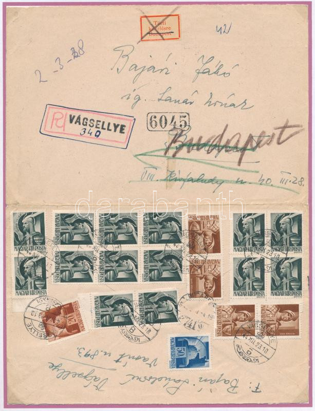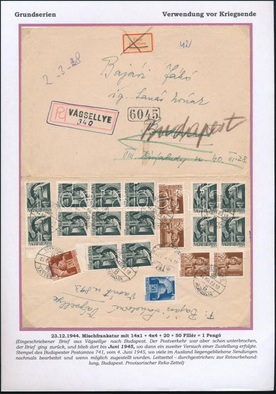1944 20 bélyeges, összesen 1P értékű ajánlott levél Vágsellyéről december 23-án feladva, amikor Budapest már ostrom alatt volt. Emiatt a levelet nem tudták kézbesíteni, azt tárolták, majd 1945. július 4-én kézbesítették. Kiállítási lapon feldolgozva, nagy kortörténeti ritkaság. / Registered cover from "VÁGSELLYE" with 20 stampt to Budapest but Budapest was already under siege. For this reason, the letter could not be delivered, it was stored and then delivered on 4 July 1945.