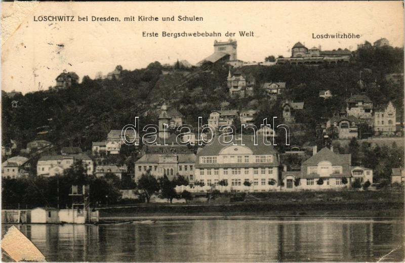 1914 Dresden, Loschwitz, Kirche und Schulen, Erste Bergschwebebahn der Welt, Loschwitzhöhe. Kunstverlag Max Köhler / church, school, funicular (glue marks)