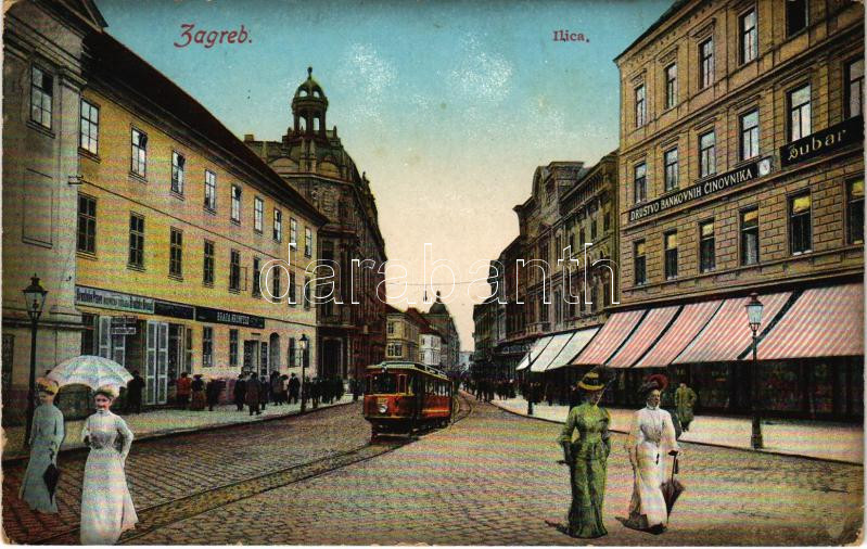 Zagreb, Zágráb; Ilica, Drustvo Bankovnih Cinovnika, Zubar / utca, villamos, fogorvos, Draga Kronfeld üzlete / street, tram, shops, dentist (EK)