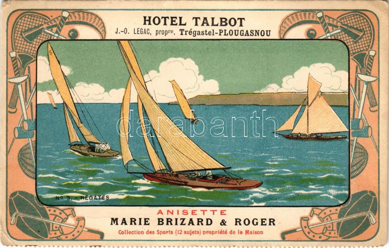 Hotel Talbot, Trégastel- Plougasnou. Anisette Marie Brizard & Roger No. 3. Régates / sailing, advertisement, from a postcard booklet. Art Nouveau litho (kis szakadás / small tear)