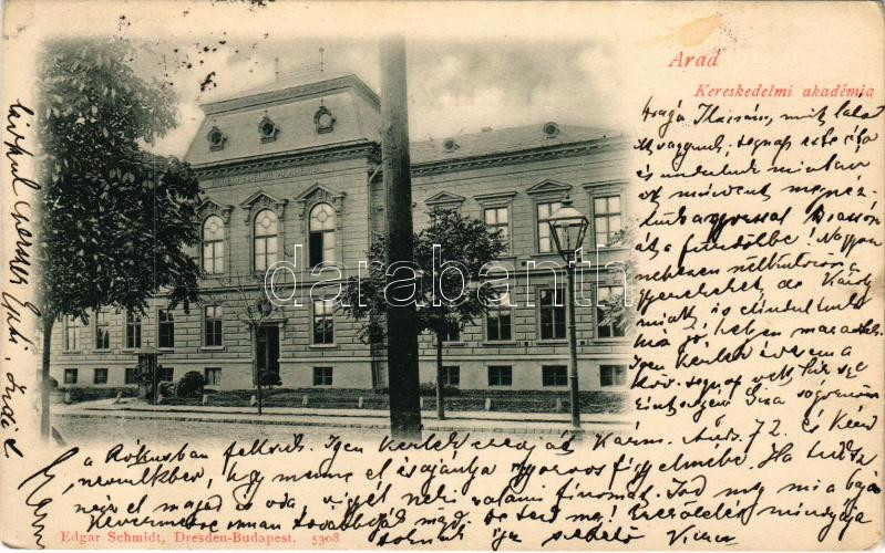 1901 Arad, Kereskedelmi akadémia. Edgar Schmidt kiadása / Academy of C... https://www.darabanth.com/de/506-Fernauktion/506.0/Ansichtskarten/Siebenburgen~112/1901-Arad-Kereskedelmi-akademia-Edgar-Schmidt-kiadasa-Academy-of-Commerce-EK~II3428053