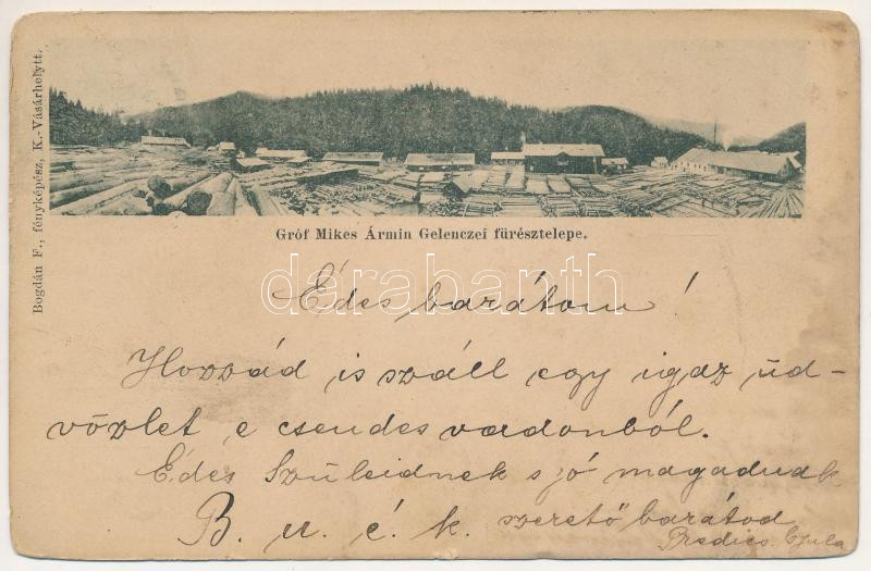 1902 Gelence, Ghelinta; Gróf Mikes Ármin gelenczei fűrésztelepe. Bogdá... https://www.darabanth.com/de/506-Fernauktion/506.0/Ansichtskarten/Siebenburgen~112/1902-Gelence-Ghelinta-Grof-Mikes-Armin-gelenczei-furesztelepe-Bogdan-F-fenykepesz-sawm~II3427321