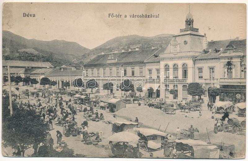 1914 Déva, Fő tér a városházával, Komáromy Kálmán, Lobstein Vilmos, Holzer üzlete, piac. Laufer Vilmos kiadása / main square, town hall, shops, market (lyukak / pinholes)