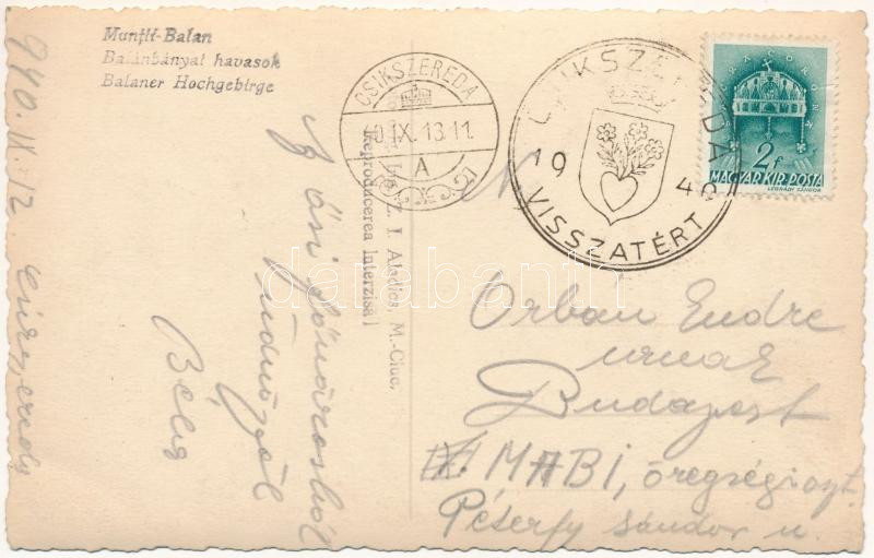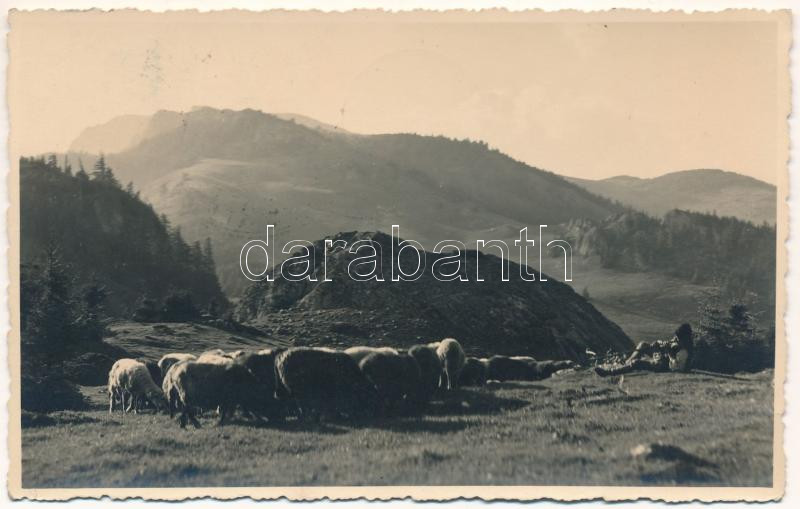 1940 Balánbányai-havasok, Muntii Balan; Birkanyáj pásztorral, erdélyi folklór / Transylvanian folklore, shepherd with a flock of sheep, photo. Foto orig. Ing. Z. I. Aladics + "1940 Csíkszereda visszatért" So. Stpl