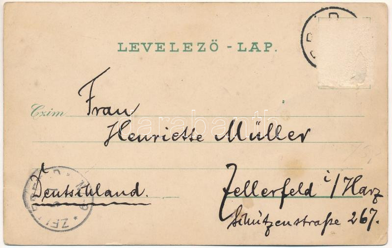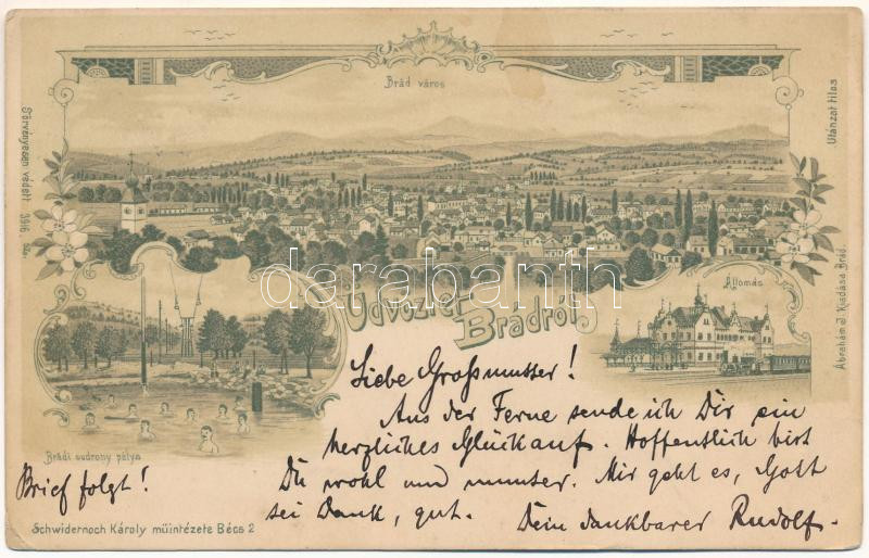 Brád, látkép, vasútállomás, gőzmozdony, vonat, sodronypálya és strandfürdő, fürdőzők. Schwidernoch Károly műintézete. Ábrahám kiadása / general view, railway station, locomotive, train, wire rope course, ropeway transport, spa, bathers. Art Nouveau, floral, litho (EK)